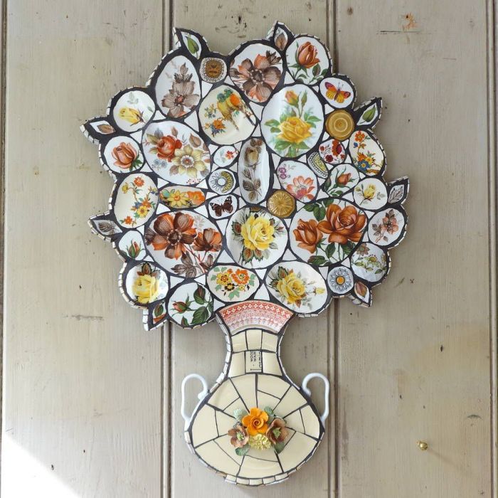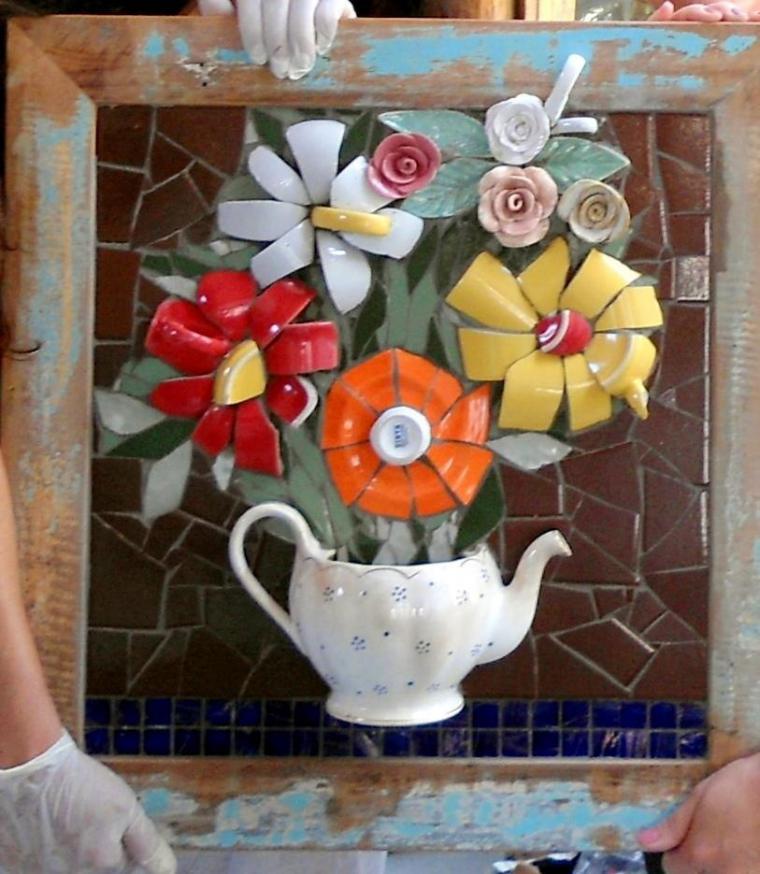 Можна реалізувати свій творчий потенціал і спробуйте викласти зі шматочків старих чашок і тарілок стильне настінне панно або картину.