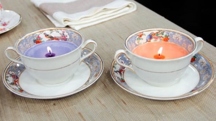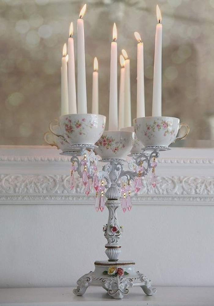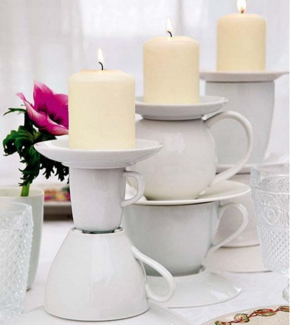 Для цього потрібні будь-який посуд - чашки, блюдця, чайники, бажано, які поєднуються між собою, клейовий пістолет, свічки. Коли будете добирати посуд для композиції, продумайте конструкцію або намалюйте на папері. Вона має бути стійкою.