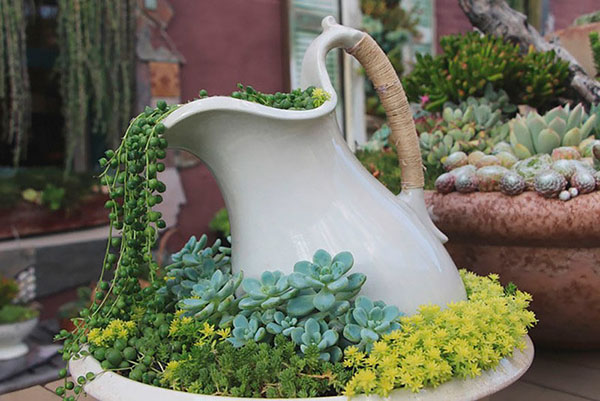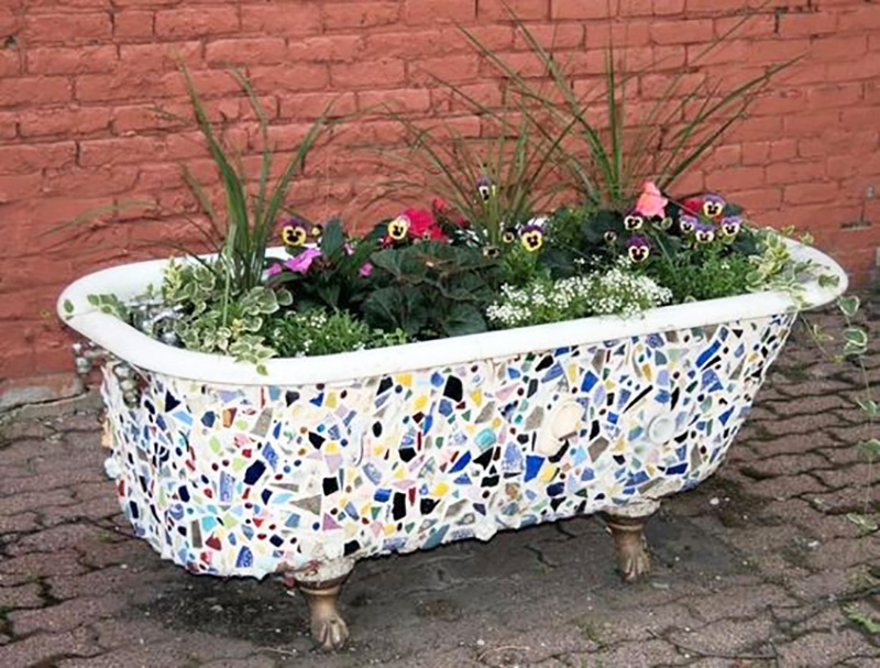 Можна використовувати старий або надбитий посуд для оформлення квітників і клумб.