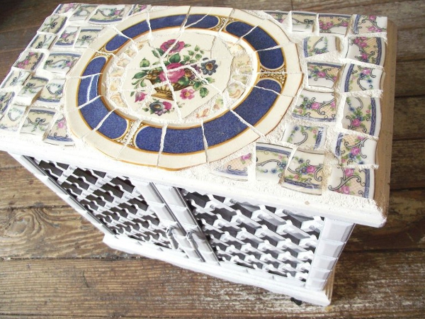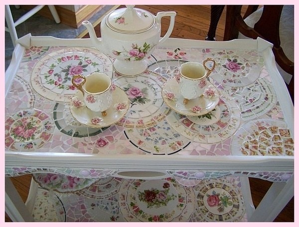 Якщо ви розбили відразу кілька предметів з улюбленого сервізу, можна оновити старий комод, стіл, етажерку і стільці, оформивши поверхню власноруч викладеною мозаїкою.