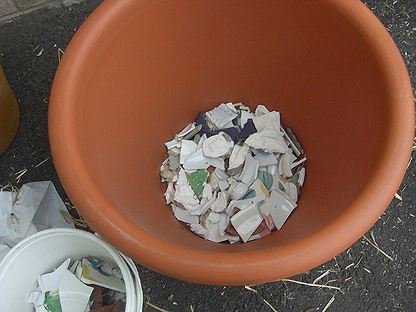 Найпростіший спосіб використання битого посуду - у якості дренажу для рослин під час посадки квітів. Для цього потрібно дрібні уламки посуду покласти на дно горщика.