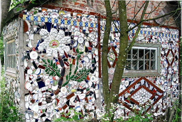 Великі шматки посуду можна використовувати в оформленні фасаду, фундаменту і стін на дачній ділянці. Поверхні покривають розчином і вдавлюють у нього залишки посуду. Комбінування різних матеріалів дає просто приголомшливий ефект. Додатково можна використовувати камінь, залишки плитки й бите скло.