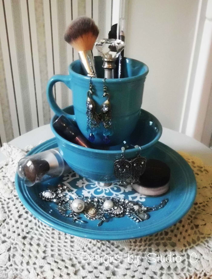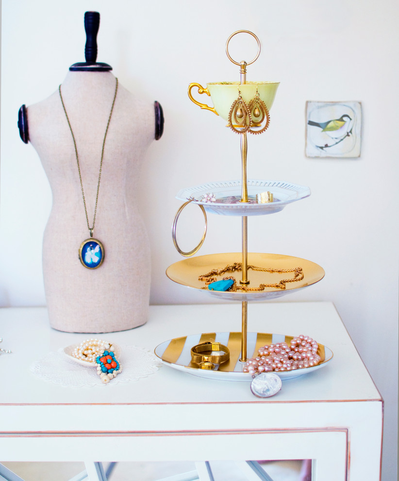 Підставку для прикрас можна зробити у вигляді багаторівневої таці, зробленої з тарлок. Нехай перший рівень буде ширше, а в ролі останнього буде глибока чашка.