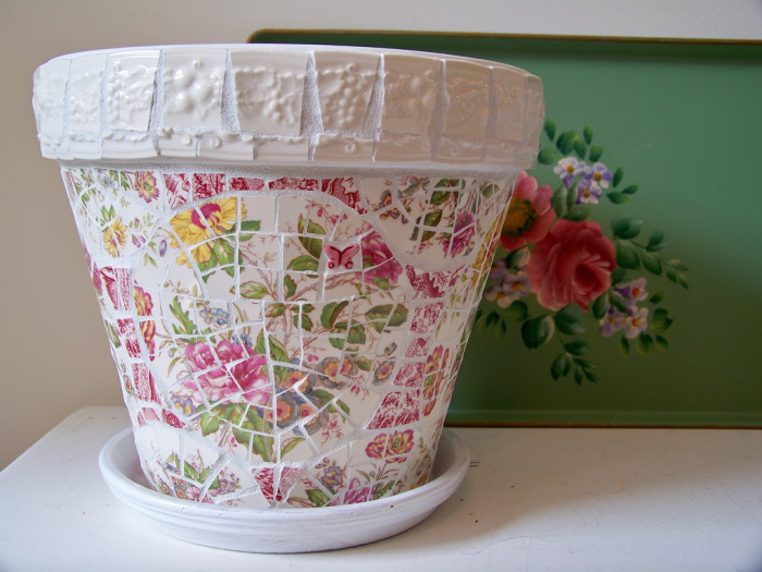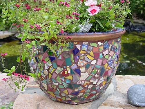 Методом мозаїки можна декорувати квіткові горщики і вази. Розташовувати шматочки можна хаотично або робити чіткі малюнки. Це більш складна робота, але трохи терпіння і ви створите неповторний горщик або вазу.