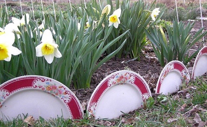 Найпростіше — зробити огорожу для клумби з вкопаних у землю тарілок, яка прослужить досить довго.