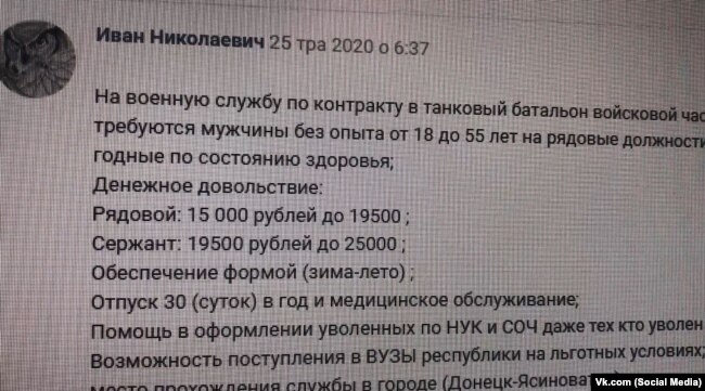 Оголошення із закликом вступати у лави контрольованих Росією бойовиків у російській соціальній мережі. Травень 2020
