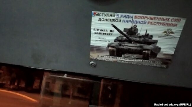Оголошення із закликом вступати у лави контрольованих Росією бойовиків у міському транспорті тимчасово окупованого Донецька
