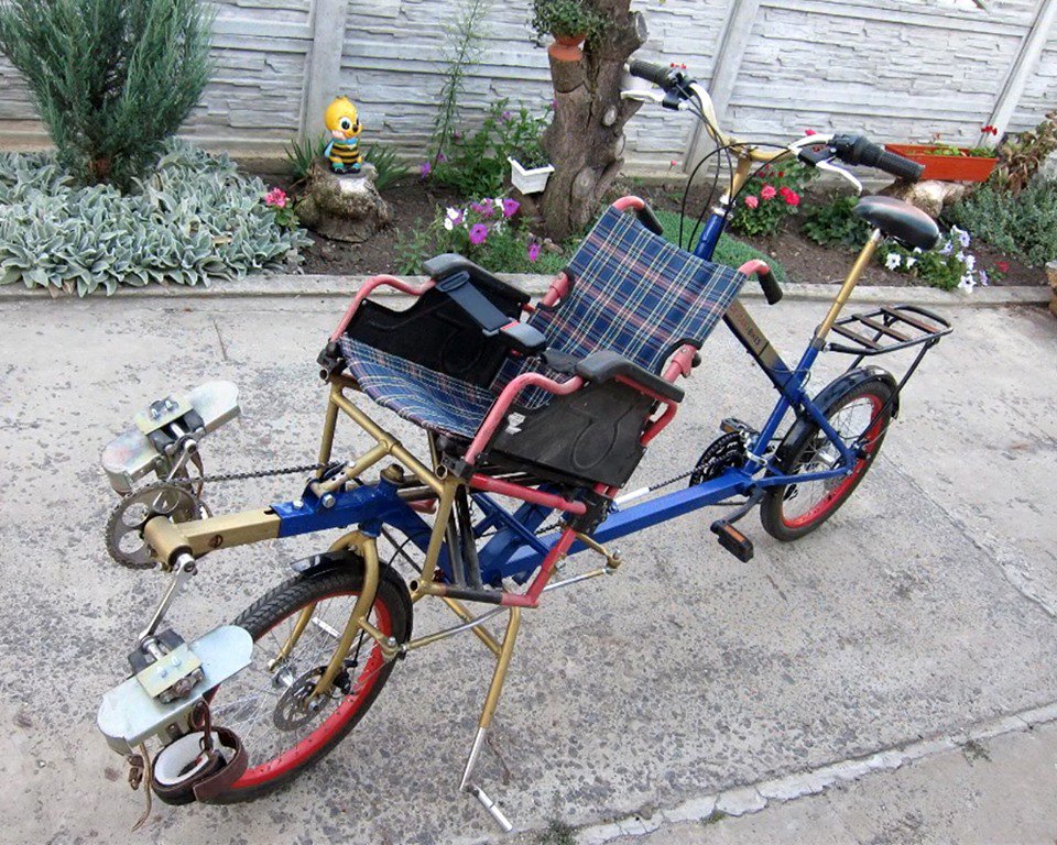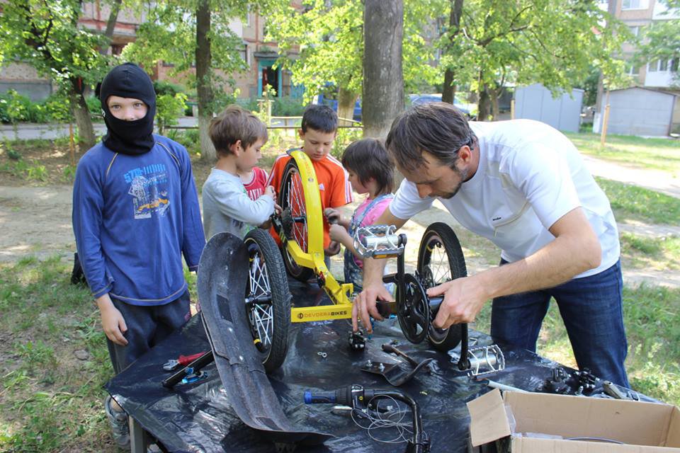 "2016 року виготовив велосипед для хлопчика з дитячим церебральним паралічем. Транспортним засобом керує батько. Син сидить попереду і теж крутить педалі. Велосипед розроблений так, щоб дитина відчувала радість руху й була активним учасником. Придумував сам, бо в інтернеті немає таких рішень. Ще нестандартне замовлення - трайк для Вінницької приватної школи. Підготував деталі, а складав велосипед зі школярами", - додав він.