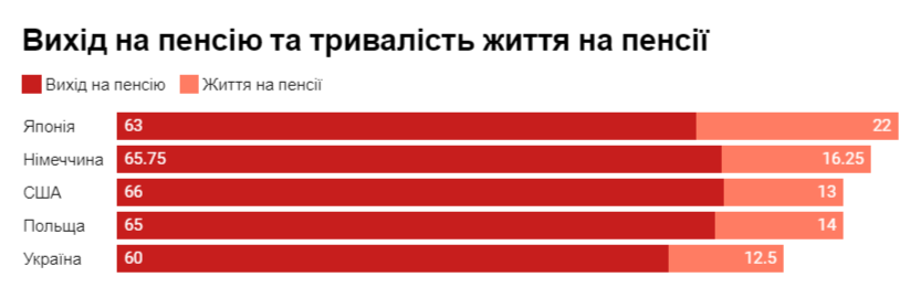 На жаль, в середньому українці лише 12,5 років проводять на пенсії у порівнянні з японцями, які насолоджуються заслуженим відпочинком на пенсії в середньому 22 роки.