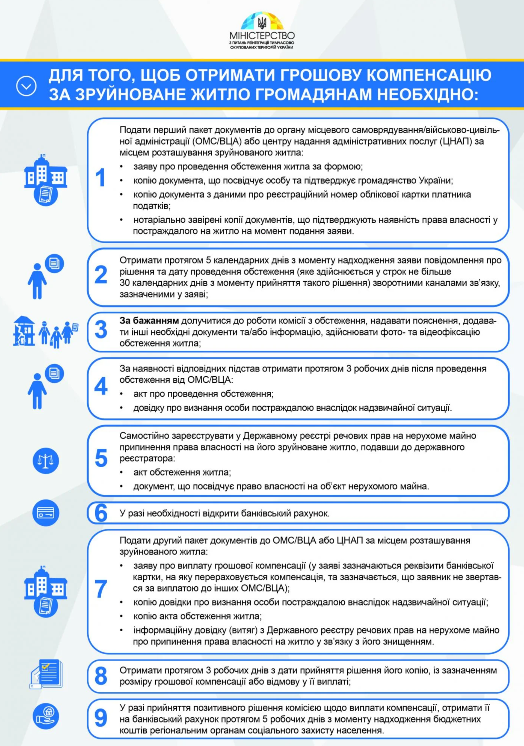 Для отримання компенсації необхідно подати пакет документів до органу місцевого самоврядування/військово-цивільної адміністрації або центру надання адміністративних послуг за місцем розташування зруйнованого житла: