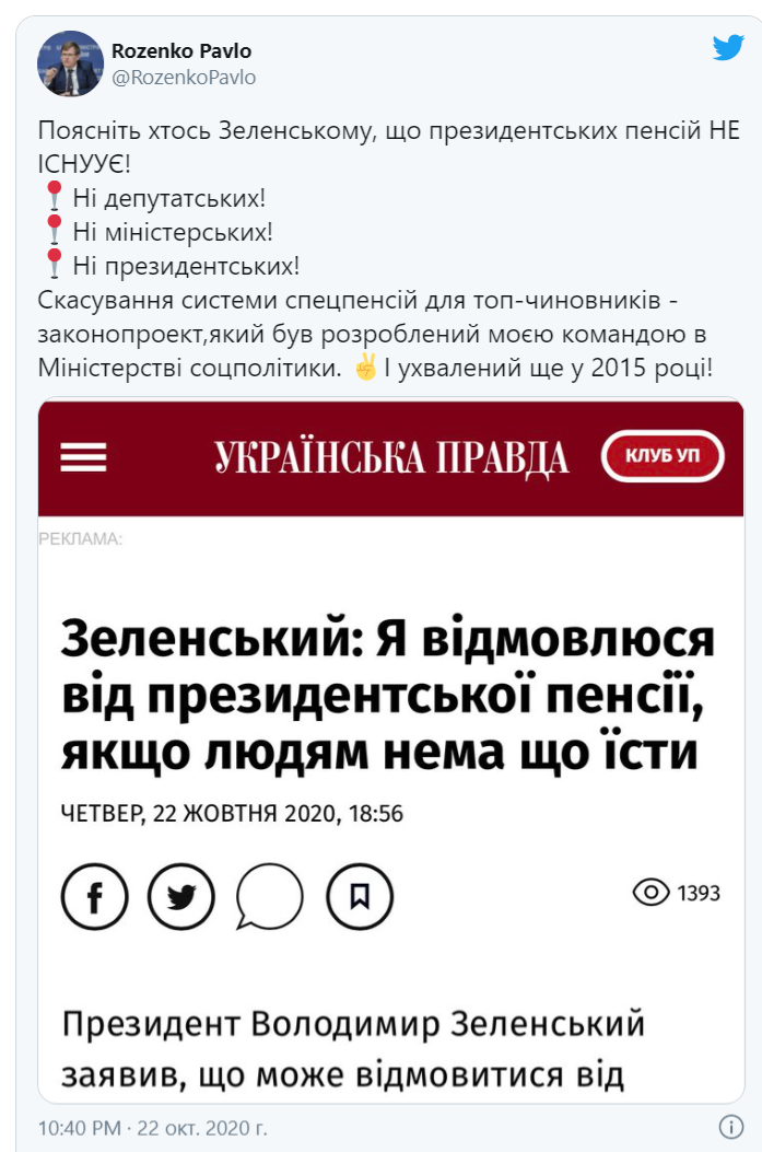 "Поясніть хтось Зеленському, що президентських пенсій існує. Скасування системи спецпенсій для топ-чиновників - законопроект, який був розроблений моєю командою в Міністерстві соцполітики. І прийнятий ще в 2015 році!" - написав Розенко в Тwitter.