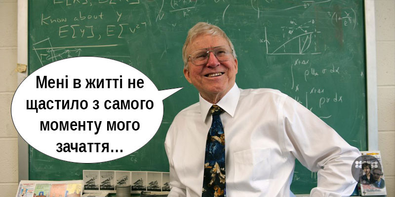 І тут він вийшов з-за кафедри, присів якось бочком на першу парту і вимовив цю саму фразу: «Мені в житті не щастило з самого моменту мого зачаття…»