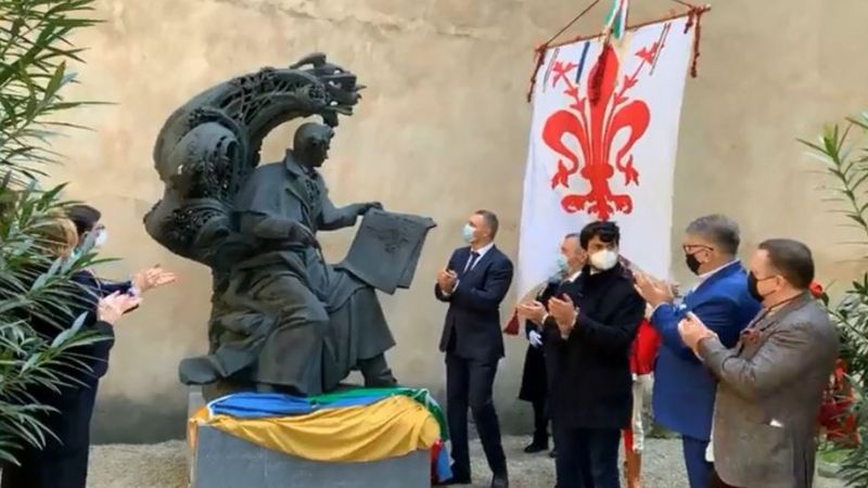 Бронзову скульптуру встановили в історичному центрі італійського міста, у саду однієї з найбільших бібліотек Biblioteca delle Oblate, повідомляє Посольство України в Італії.