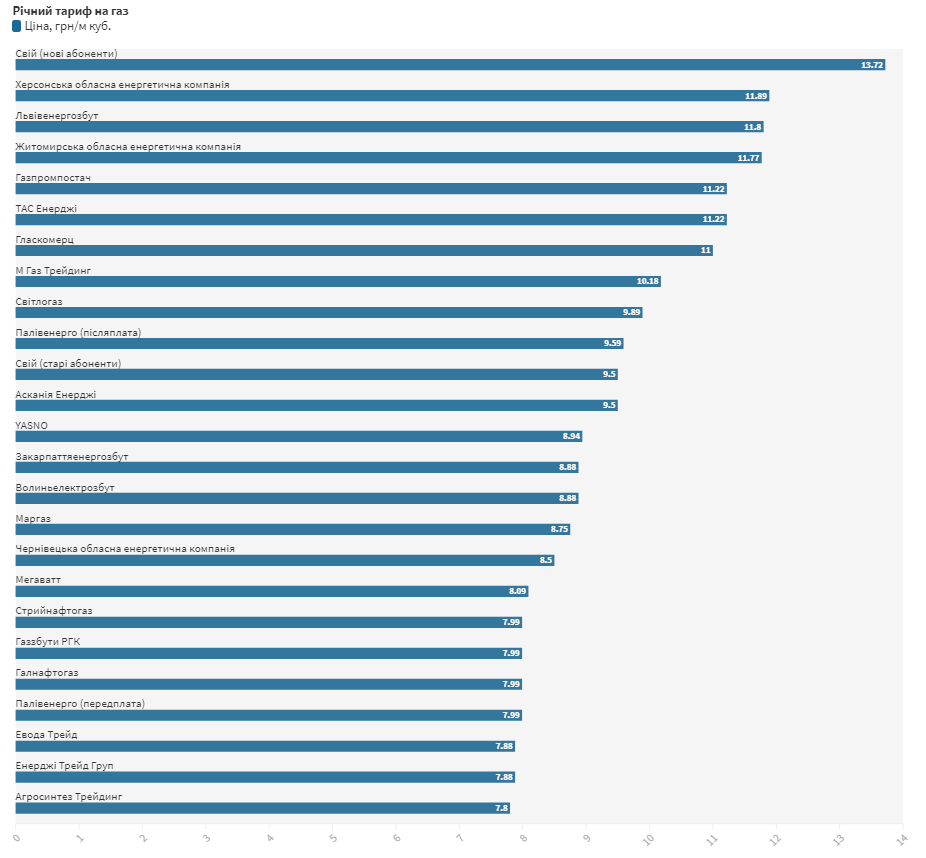 Найдешевші пропозиції оприлюднили три компанії – «Агросинтез Трейдинг» 7,8 грн/м3, «Евода трейд» та «Енерджі Трейд Груп» 7,88 грн/м3.