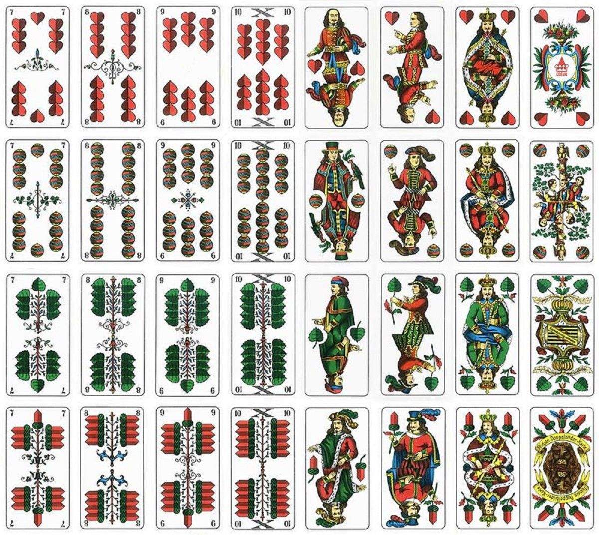 Німецька колода зазнала кількох трансформацій протягом своєї історії. Сьогодні вона складається з 32 карт, але раніше їх було 48. До 16 століття на старших картах зображали короля, королеву, обер-офіцера та унтер-офіцера. Потім королев прибрали, а замість них додали тузи.