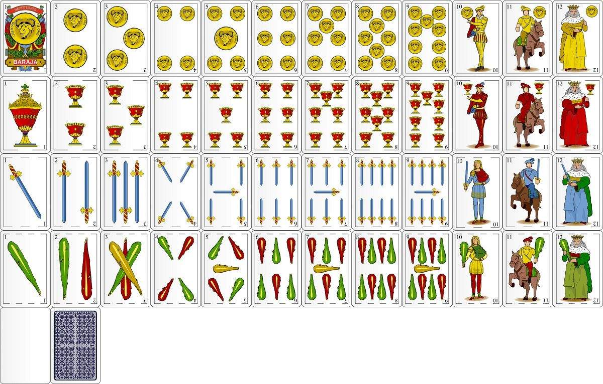 Стандартна італо-іспанська колода складається з 50 карт. У ній відлік карт розпочинається з "1" та закінчується "9". Дам у такій колоді немає, але є валет, лицар, король та джокер.