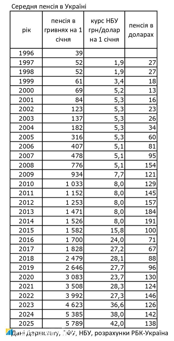 В Україні доступні дані Держстату щодо середньої пенсії з 1996 до 2018 року. За останні роки інформацію публікує Пенсійний фонд України. Дані свідчать, що у 1997 році пенсія складала 52 гривні. До 2025 року вона зросла у 111 разів до 5 789 гривень.