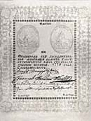не был забыт. 1 января 1769 года были учреждены два банка: один в Санкт-Петербурге, другой в Москве с основным капиталом в 50 000 рублей медью каждый. На банки был возложен обмен медных денег на государственные ассигнации четырех достоинств: 25, 50, 75 и 100 рублей. Их печатали черной краской на белой бумаге с водяными знаками. В Санкт-Петербурге и Москве частные лица были обязаны внести из расчета на каждые 500 рублей казенных платежей по крайней мере одну ассигнацию в 25 рублей. Выпуск ассигнаций мотивировался тем, что "тягость медной монеты, одобряющая ее собственную цену, отягощает ее же и обращение". Но более существенной причиной явилась необходимость изыскания средств на ведение русско-турецкой войны. Согласно плану генерал-прокурора Сената князя А.А. Вяземского предполагалось выпустить ассигнаций на сумму 2.5 млн. рублей под обеспечение разменным фондом 2 млн. рублей и, таким образом, использовать 500 тыс. рублей для покрытия государственных расходов. Так в оборот вошли бумажные деньги, которые до сих пор используются, как средство платежа