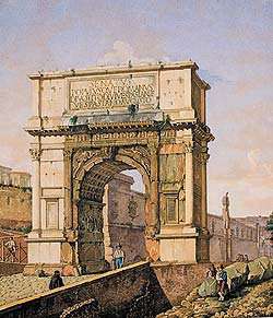 Прямо напротив входа в Тициановский зал весьма символично помещено изображение знаменитой арки Тита в Риме – постройки эталонной и совершенной. Возведенная в 81 году н. э. на древней священной дороге к юго-востоку от римского Форума в память о взятии Иерусалима (70 год н. э.), она послужила образцом для многих триумфальных арок Нового времени. Частично разрушенная в Средние века арка Тита была отреставрирована в 1821 году Джузеппе Валадье, воссоздавшим отсутствовавшие элементы (чтобы их отметить) не из мрамора, а из травертина. Эти «отметки» присутствуют и на выполненном в 1836 году рисунке Александра Дурнова, а совершивший в 1830-е годы пенсионерскую поездку в Италию архитектор был удостоен по ее результатам звания академика.