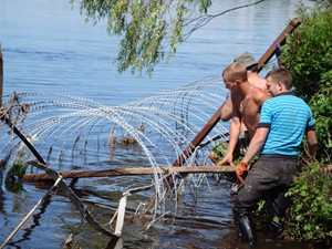 То, что произошло на Осокорках – стало верхом беззакония. Шлюз №1 – государственное гидротехническое сооружение, входящее в состав Бортнической станции аэрации. Именно в том месте выходят трубы по которым в Днепр сбрасывает станция очищенную воду. О качестве этой очистки… отдельный разговор. Но в народе это место называется «бурло». Зимой и летом там постоянно держится рыба в поисках корма. Чего только не попадает в реку через эти трубы… Поражает тот факт, что именно это место было выбрано захватчиком-застройщиком… Некоторые не очень брезгливые столичные рыболовы там постоянно ловят рыбу. Вот от них и была поставлена поздней осенью 2012 года колючая проволока на берегу. Рыболовы попытались ее оттащить в сторону, освободив небольшие подходы к воде, на что землезахватчик ответил оперативно – зацементировав глубоко в берег каркас на котором была натянута проволока. Не всякая тюрьма «похвастается» наличием такого класса «колючкой». Многие рыболовы падали в нее разрывая кожу, вырывая куски мяса освобождаясь. Страшная кровавая картина порой разворачивалась на берегу…
