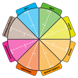 области жизни по шкале от 0 до 10. С ее помощью мы определяем степень удовлетворенности конкретной сферой жизни и обозначаем на осях соответствующие значения. Затем последовательно соединяем все точки и смотрим, похожа ли фигура на колесо.