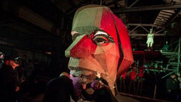 Под конец перформанса-открытия над гостями фестиваля взлетела железная скульптура Гоголя. Она взымалась до крыши завода, в то время как ее и всех внизу засыпали золотым дождем.
