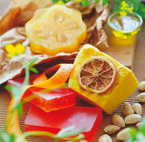Рецепт: 150 г мыльной основы, 2 апельсина, несколько капель апельсинового ароматического масла, несколько капель желтого пищевого красителя, мочалка круглой формы из натурального волокна (нарезать кружочками).