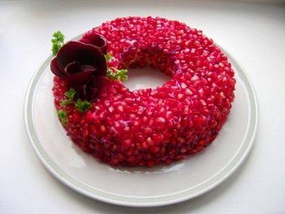 1-й слой: картофель чуть-чуть соли, смазать майонезом 2-й слой: морковь чуть-чуть соли , майонез 3-й слой: грецкие орехи 4-й слой: окорок курицы , майонез 5-й слой: лук (можно жареный) 6-й слой: свекла , майонез 7-й слой: гранат Приятного аппетита!