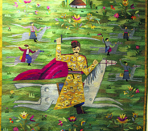 Казацкая баллада. На двухметровом ковре изображены украинские казаки, которые боролись за свободу в Украине в ХVII веке. Несколько казаков на заднем плане, скачущих галопом на лошадях, по замыслу мастера, символизируют стремление к свободе. Неподалеку — хата, как символ Украины, которую они оберегают ценой своей жизни. Ковер называется «Казацкая баллада» — в его центре красуется кошевой атаман.