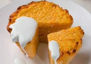 Очищенную морковь натереть на мелкой терке, залить 2 л холодной воды и вымачивать 3-4 часа, меняя воду каждый час. Затем морковь отжать сквозь марлю, залить молоком, добавить 10 г масла и тушить. В готовую морковь ввести желток, смешанный с протертым творогом, а также взбитый белок и сахарин, все это вымешать, выложить в формочку, смазанную маслом и обсыпанную отрубями, и выпечь. Подать к столу со сметаной.