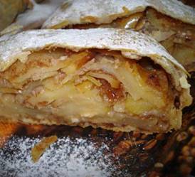 Положить рулет швом вниз на противень и выпекать при температуре 200 градусов минут 40, периодически поливая штрудель растопленным сливочным маслом.