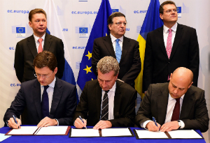 Подписи под документом поставили министры энергетики РФ и Украины Александр Новак и Юрий Продан и вице-президент Еврокомиссии, ответственный за энергетику, Гюнтер Эттингер.