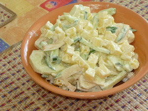Что ещё может входить в вечернее меню – рассмотрим подробнее. Рецепт салата "Радость" с огурцами и сыром (подойдёт и для самостоятельной вечерней трапезы, и для встречи гостей) Ингредиенты: Яйцо куриное – 2 шт. Огурцы свежие – 3 шт. Лук зеленый – 2-3 пера Сыр твердый – 50 г Чеснок – 1-2 зубчика Сметана 10-%ной жирности – 100 г Соль, зелень – по вкусу Как готовить. 1. Отварить яйца, очистить и нарезать их кубиками. Огурцы нарезать соломкой, зелёный лук – кольцами. 2. Сыр натереть на мелкой тёрке, чеснок раздавить в чесночнице, зелень – мелко порезать. 3. Все ингредиенты смешать в миске, посолить, заправить сметаной и снова тщательно перемешать. В 100 граммах салата – 83,5 ккал: 5 г белков, 5,9 г жиров, 2,6 г углеводов.