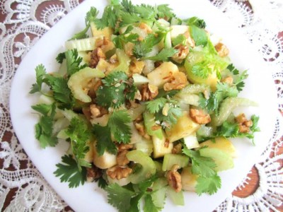 А вот – полезные блюда для романтического ужина: "Лодочки" из яиц с оливками Ингредиенты: Яйца куриные – 6 шт. Творог – 100 г Лук зелёный – 2-3 пера Салат зелёный – 1 пучок Петрушка – 10 г Масло сливочное – 2 ст. л. Оливки – 12 шт. Чеснок – 2 зубчика Сахар – 3 г Перец чёрный молотый – 1 г Соль – по вкусу Как готовить. 1. Сварить яйца вкрутую, очистить их и разрезать каждое вдоль на 2 части. 2. Достать из яиц желтки и в отдельной миске смешать их со сливочным маслом и творогом. 3. Растолочь чеснок, нарубить петрушку и зелёный лук. 4. Добавить в желтковую смесь толчёный чеснок, соль, перец, подготовленные петрушку и лук. 5. Красиво разложить листья салата и разместить на них "лодочки" из белков. 6. Из желтковой смеси сформировать 12 шариков и положить их в белки. 7. Сверку каждую лодочку украсить оливкой. В 100 граммах блюда – 114 ккал: 8,7 г белков, 7,7 г жиров, 2,4 г углеводов. Салат из сельдерея с яблоками и орехами Ингредиенты: салат-латук – 4-5 листьев сельдерей – 3 стебля яблоки – 2 шт. лимон – 1 шт. сметана – 150 г изюм – 100 г орехи грецкие – 100 г соль, молотый перец – по желанию и по вкусу Как готовить. 1. Яблоки и сельдерей порезать кубиками и выдавить на них сок лимона. 2. Всё перемешать, по желанию – добавить соль и перец. Заправить салат сметаной. 3. Подать салат на блюде, украсив с разных сторон листьями латука. В 100 граммах блюда – 148 ккал: 2,4 г белков, 9,5 г жиров, 13,2 г углеводов.