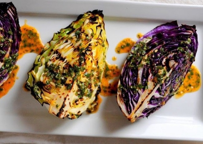 В блендере смешайте сок лайма, оливковое масло, чеснок, кинзу, соль, сахар до бледно-оранжевого цвета. Очистите от жестких листьев и разрежьте капусту на клинья, смажьте их оливковым маслом. Готовьте с каждой стороны в течение 5-7 минут на гриле, пока края каждого слоя не почернеют. Вылейте соус на капусту и подайте с дольками лайма.