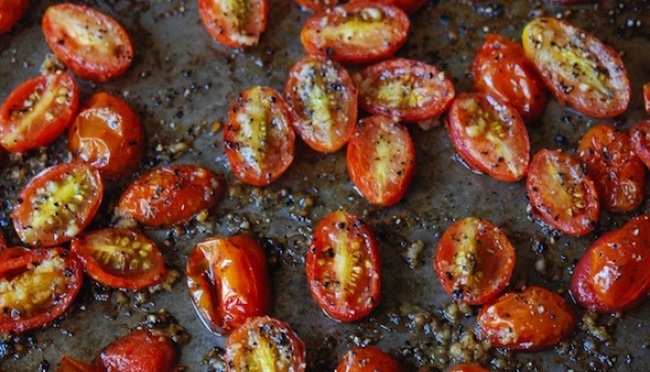Разогреть духовку. В миске перемешать разрезанные пополам помидоры, чеснок, оливковое масло, соль и перец. Поместить все это на противень, выпекать 20-25 минут.