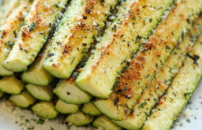 Разогрейте духовку. В маленькой миске смешайте сыр, тимьян, орегано, базилик, чеснок, соль и перец по вкусу. Поместите нарезанные ломтиками цукини на противень. Полейте оливковым маслом и посыпьте сырной смесью. Выпекать до готовности, около 15 минут, а после поджарить в течение 2-3 минут до хрустящей корочки.