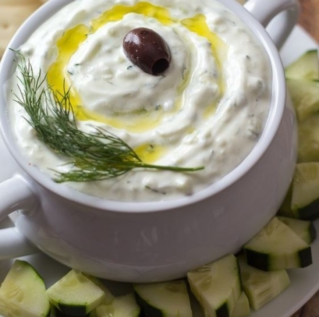 Натереть на терке огурец. Смешать йогурт, чеснок, масло, уксус и соль в большой миске. Добавить в смесь тертый огурец и укроп. Подавать охлажденным. Можно с лавашом.
