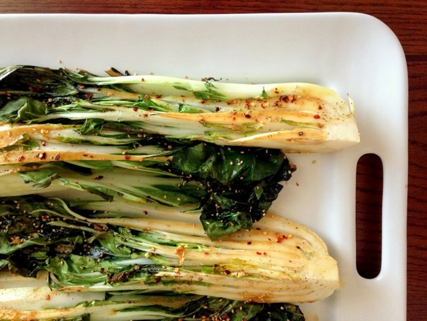 Разогреть духовку. Приготовить маринад из смеси оливкого и кунжутного масел, соевого соуса, измельченного зубчика чеснока и семян кунжута. Разместить капусту на противень и залить маринадом. Запекать 6-7 минут.
