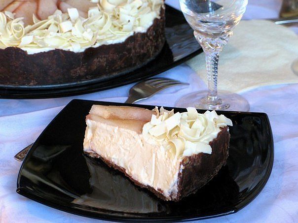 Сливочное масло распустить в сотейнике. Печенье раскрошить (можно положить печенье в пакет и накрыть полотенцем, а потом пройтись хорошенько по нему скалкой). И вместе с какао подмешать к маслу. Полученную массу выложить в форму (d24 см), выстланную бумагой для выпечки, разровнять, сделать бортик около 5 см. И убрать в холодильник на 1 час (или в морозилку примерно на полчаса). Шоколад растопить на горячей водяной бане. Немного остудить. Сливки взбить с закрепителем или крахмалом в крутую устойчивую пену и подмешать к еще жидкому шоколаду. Аккуратно перемешать вручную! Смешать творожный сыр с йогуртом и сахаром, перемешать венчиком и подмешать к шоколадно-сливочной массе. Выложить крем на основу из печенья. Поместить заготовку на 1 час в холодильник. Грушу очистить, разрезать пополам, сердцевину удалить. Вино вскипятить с сахаром, положить грушу и оставить на 1 ч в винном сиропе. Периодически переворачивать. Грушу хорошенько просушить бумажным полотенцем, нарезать тонкими дольками и выложить на торт от серединки по кругу. Украсить торт можно шоколадной стружкой. При помощи овощечистки сделать вот такие завитушки из шоколада. После чего снова убрать тортик на ночь в холодильник, чтобы начинка окончательно закрепилась. Также можно украсить тортик шоколадными палочками и листиками груши (можно взять мяту или мелиссу).