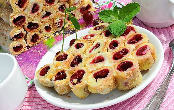 6. Края полосок поднимают над вишней и тщательно склеивают в трубочки.