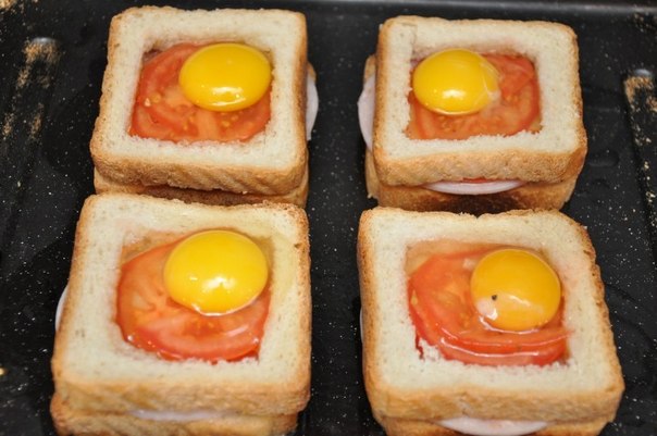 2. На остальные 4 кусочка хлеба положить по 2 пластинки ветчины, на них – оставшиеся 4 хлебных «ободка» без мякиша. Внутрь ободков положить нарезанные кружочки помидоров и разбить в каждый бутерброд по яйцу. Посолить, поперчить.