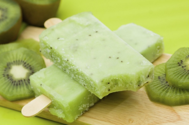 Измельчите в блендере киви, смешайте с любым вашим любимым соком. Подсластите медом и разлейте в формочки.