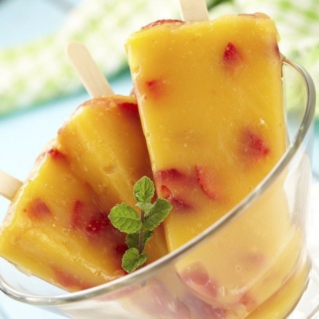 Тут все просто: манго прокрутить в блендере, добавить воды и залить в формочки с кусочками клубники. Можно просто взять сок манго и не заморачиваться с блендером.