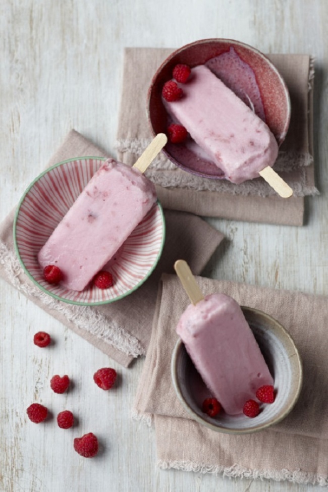 В блендере смешиваем йогурт с малиной и заливаем в формочки.