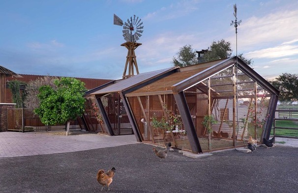 Для участков в современном стиле можно использовать более лаконичные и геометричные формы. Но это совершенно не обязательно должен быть традиционный «домик». Птичник и теплица такой динамичной пятигранной формы со скошенными стенками выглядят современно и экологично.