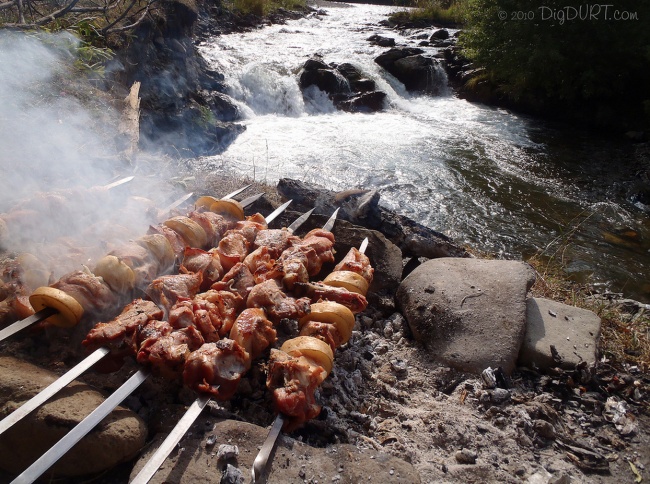 Лук нарезают колечками, мясо — крупными кусками. Помидоры — толстыми кольцами. Лук мелко рубят, из лимона выжимают сок. Барбарис и перец растирают в ступке. Мясо солят и добавляют пряности, ткемали и сок лимона, перемешивают. Выкладывают слоями лук, мясо, помидоры, слой зелени. Придавливают гнетом и оставляют на 3 часа.