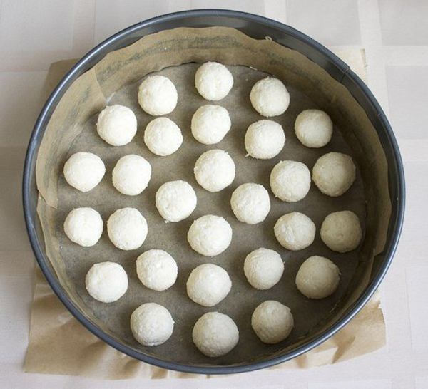 1. Перетри творог через сито, а яйцо взбей вместе с сахаром добела. Смешай творог с яйцом, добавь еще муку и кокосовую стружку и тщательно перемешай ингредиенты. Скатай из приготовленной массы небольшие шарики и выложи их в форму для запекания, предварительно застелив ее бумагой и смазав маслом.