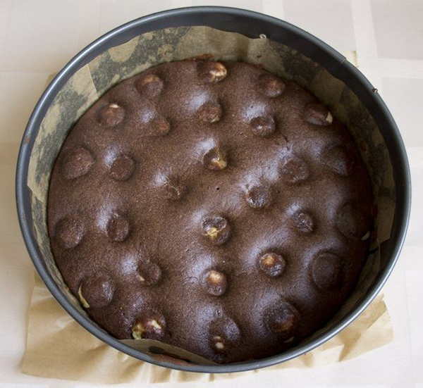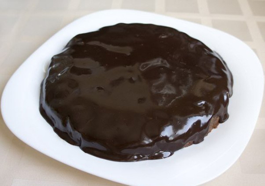 3. Пока пирог выпекается и остывает, приготовь шоколадную глазурь. Шоколад растопи на водяной бане, добавь сливки или молоко, сахар и масло. Перемешай. Когда пирог остынет, достань его из формы и полей глазурью.