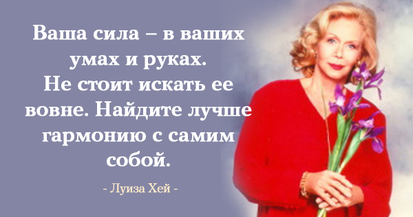 Луиза Хей – талантливый психолог, одна из основателей техники самопомощи через позитивное мышление и позитивные установки, автор более 30 книг по психологии. Один из ее бестселлеров «Ты можешь исцелить свою жизнь» переведен более чем на 30 языков мира, и уже перевернул жизни сотен тысяч людей с ног на голову. Основная идея книги – каждый сам кузнец своего счастья. Звучит довольно просто, не так ли? Тогда почему среди нас так много пессимистов и несчастных людей, которые не могут справиться со своими проблемами? Может, следует просто по-другому взглянуть на жизнь и понять свое место в ней? О том как стать счастливым и справиться с проблемами и переживаниями, а так же о том, как сделать жизнь сказкой со счастливым концом мы расскажем тебе в этой статье. Предлагаем твоему вниманию 25 лучших цитат талантливого психолога Луизы Хей, которые помогут изменить твою жизнь в лучшую сторону. Позитивный настрой творит чудеса!